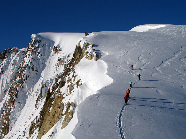 The final slope up to the Hollandia hut. The snow, though slightly discolored by recent Sahara sand-storm deposits, was soft and corn-like over a firm base. Not bad! |