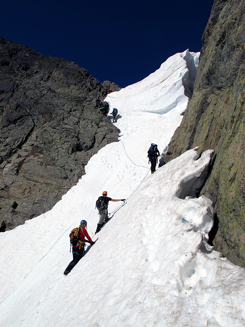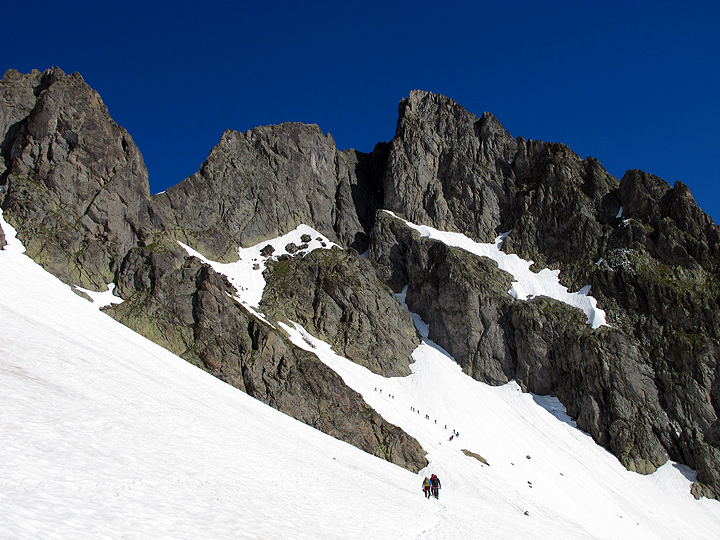 Quite a few other climbers heading over to "our" climb. From the low notch in the ridge on the left, we climb up the rocky skyline to the summit, which is just right of center. |