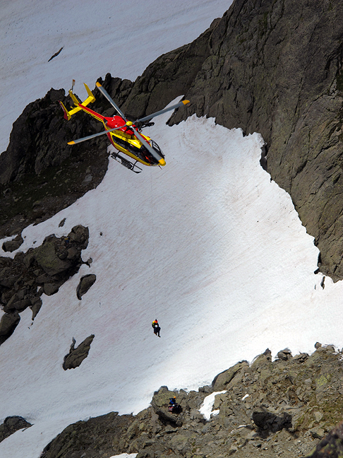 Unfortunately, there were a couple accidents, only minutes apart, and only a few meters from one another – roped climbers falling down the moderately steep snow slope. We don't think the injuries were especially serious, but they did get air-lifted down to the valley. |