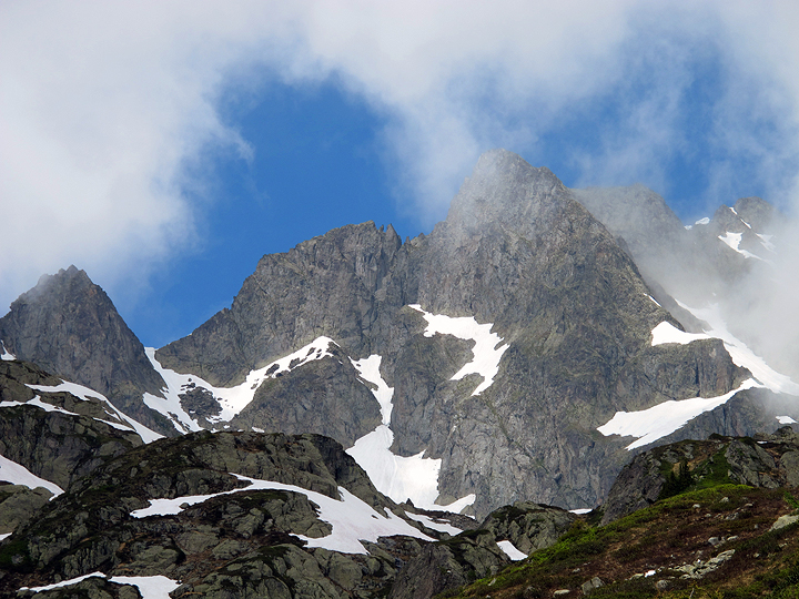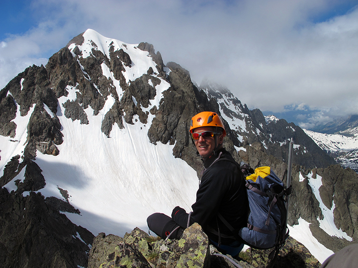 This photo, taken on the descent shows the peak and the route (roll your mouse over to see the route up). The accidents occurred on the snow slope just below the notch on the left. |