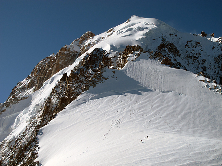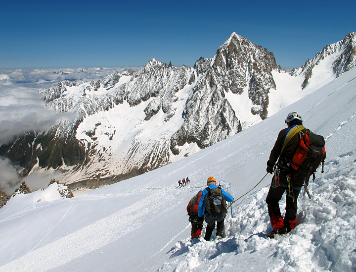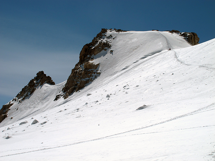 | But with patience we made our way down. Somebody did manage to trigger an avalanche (debris below the further climbers). Even with the crowds, we had a good day. |