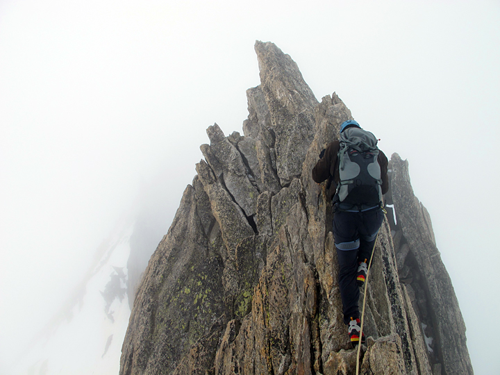 | Day 2, climbing on the Aiguille d'Entreves. Mostly in the fog this day, but fun climbing even so. I don't have photos from days 3 (the Chapelle de la Gliere) and 4 (Diretto al Banano). Oh well. |