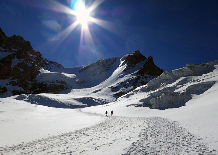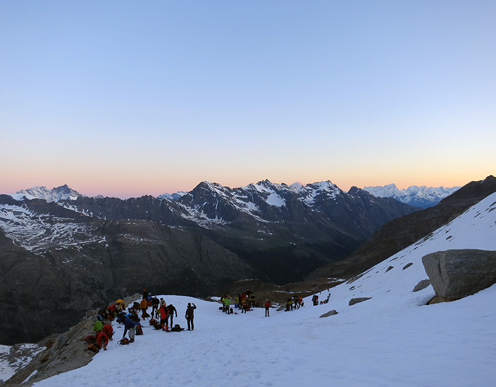 At dawn the next day, we pause to rope up and don crampons for the glacier. A busy spot! |