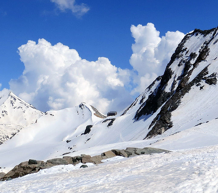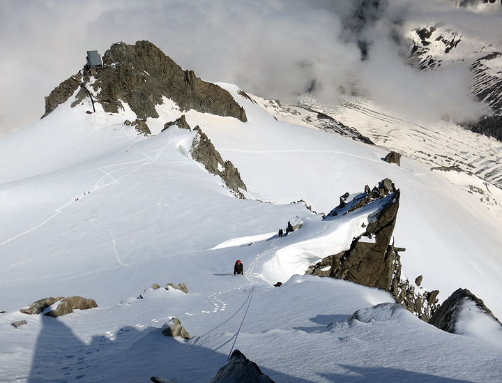 Our next project was the Hohlaubgrat on the Allalinhorn, beginning with a quick afternoon hike up to the Brittania hut, shown here. |
