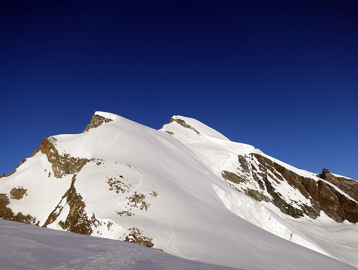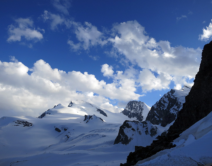 From the hut, evening views of the Strahlhorn and Rimpfischhorn. Part of our ridge is just visible on the right, behind the black foreground ridge. |