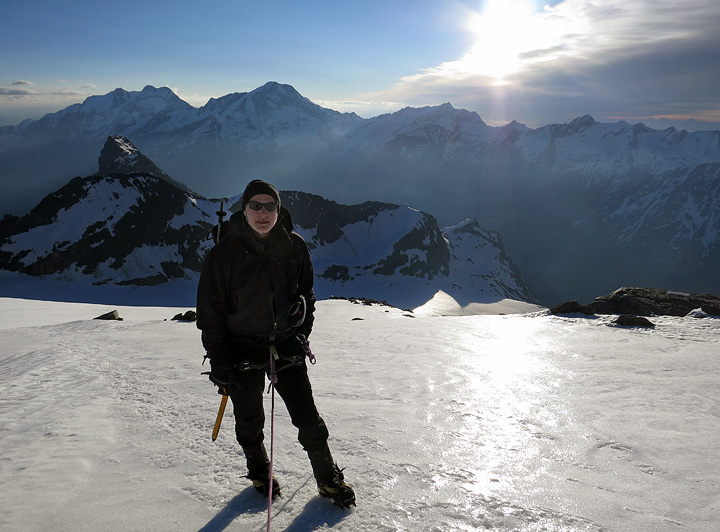 We are relieved to get to firmer snow after some punchy bits down low. The clouds were just clearing out as the sun rose. Weissmies and Lagginhorn in the background. |
