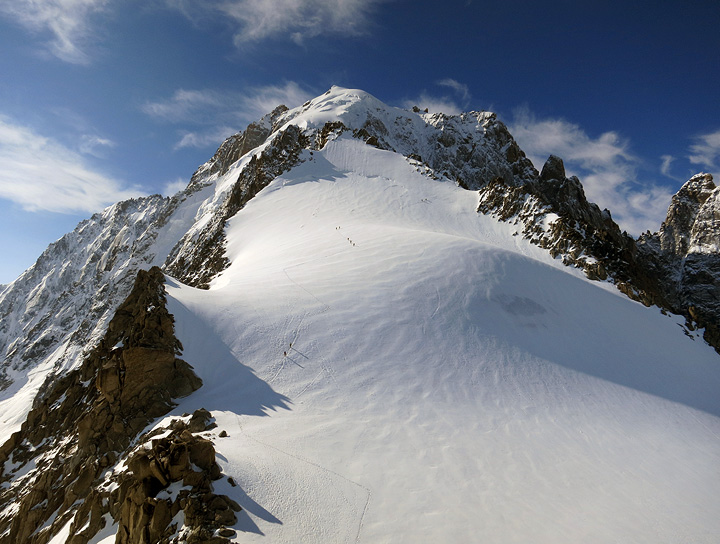 We climbed the face, directly up to the summit pyramid. Another party behind us passing by the "demi-lune", a snowy scoop about midway up. |