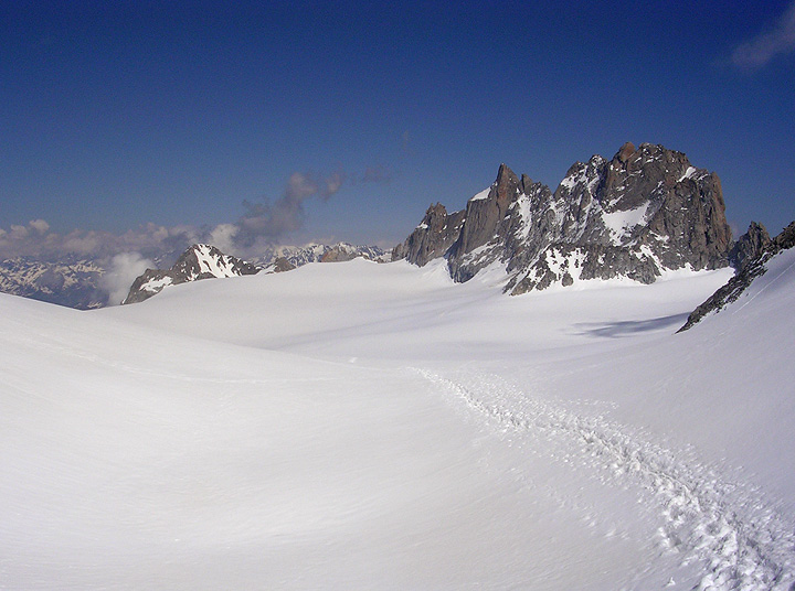 I (Kathy) didn't get many shots on this very long first day, but Don managed to get this just as we crossed into Switzerland over the Col Supérieure du Tour, en route to the Orny hut. Great conditions on the Trient glacier! |