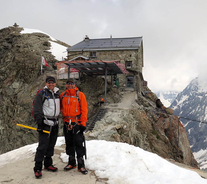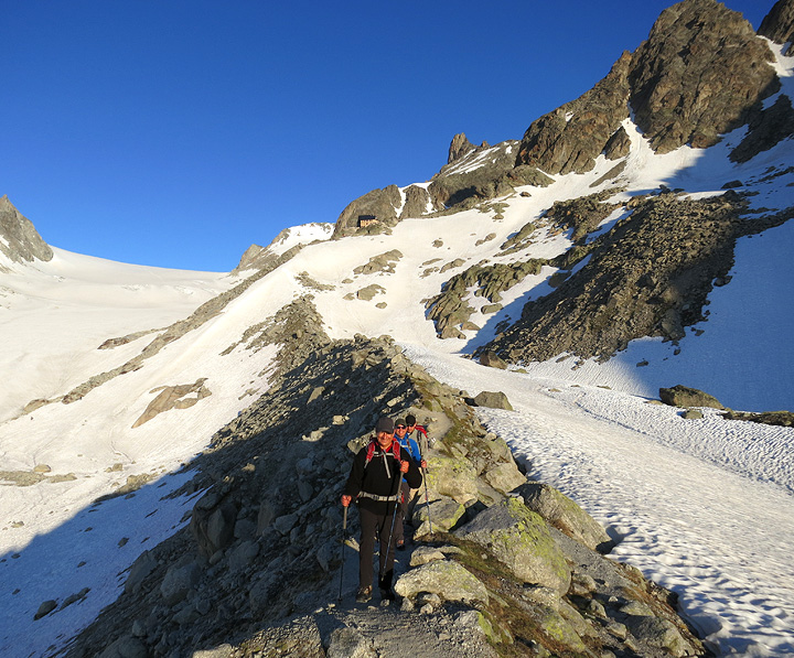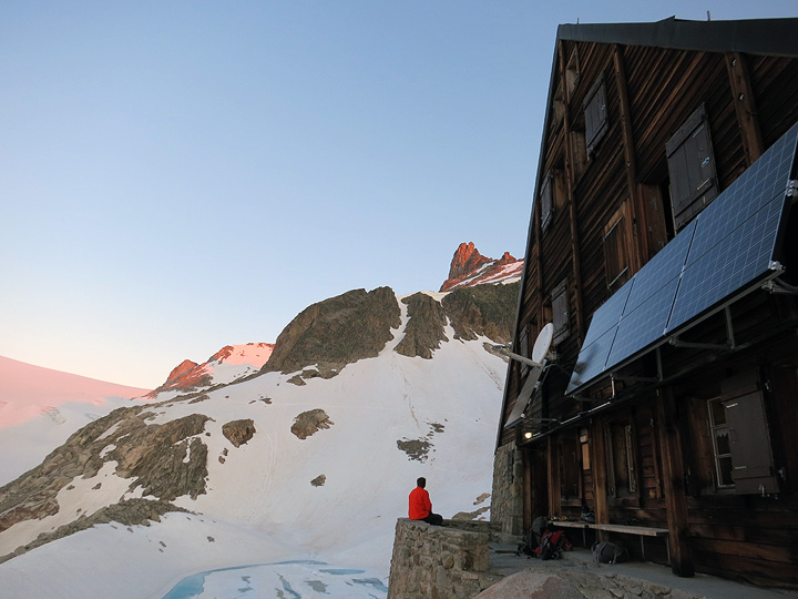 Looking back up at the hut from the glacier, we are off to climb the Tête Blanche. |