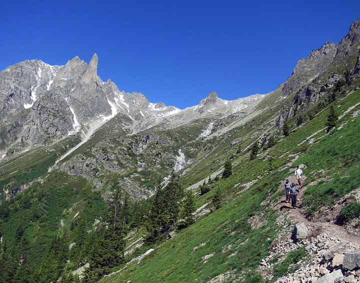 Here are the lads, starting out on day 1 from near the Col de Balme, above the village of Le Tour. Mont Blanc, the Drus, and the Aiguille Verte are in the background. It's a beautiful day to hit the trail! |