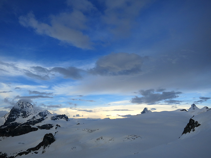Nearing our summit, the cloud build-up kindly holds off for us to get our views and photos in. The Matterhorn is just getting engulfed on the far left, the Dent d'Hérens still clear in the center of this shot. |