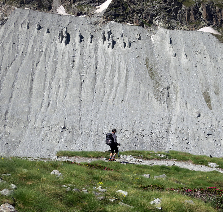 From Arolla we headed next up to that other crown jewel of the Swiss Alpine Club hut system, the Bertol. The boys pause on the way up. Over Jon's blue-and-white checked left shoulder would be the Vignettes hut, if our eyes were good enough to make it out. |
