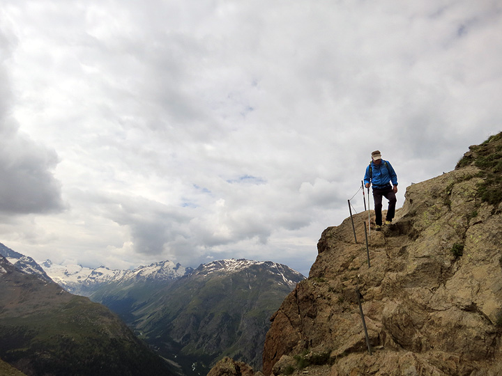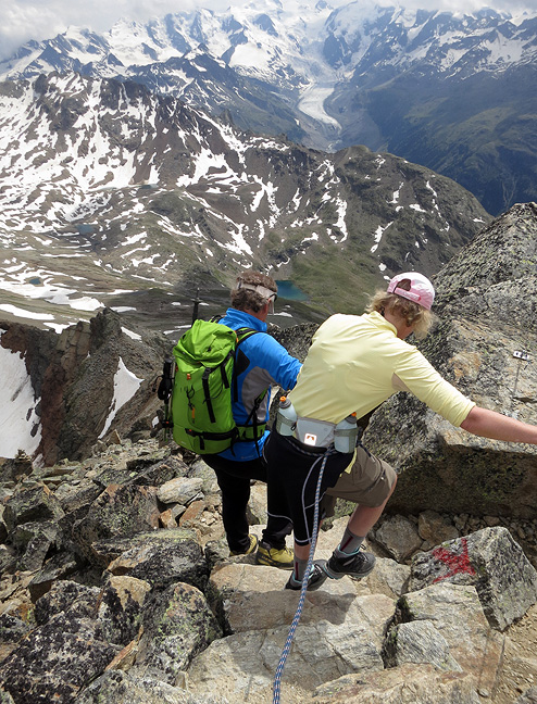 Descending the tricky and exposed "trail" of the Piz Languard. |