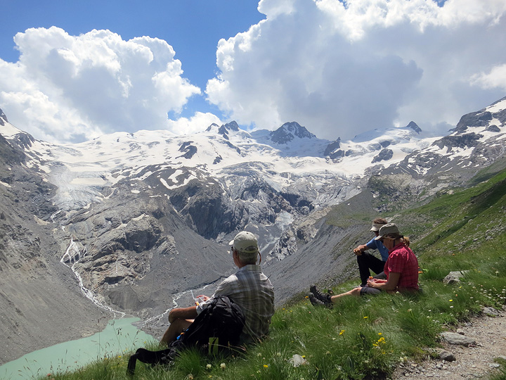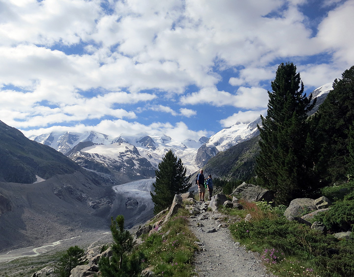 The next day we took a bit of a rest, scattering to various explorations and activities around Pontresina and environs. Brooke and Bill on the trail up toward the Boval hut, with the Morteratsch Glacier and Piz Palu behind. |