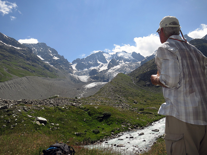 Continuing up the valley, we draw abreast of Piz Bernina high above. Bill admires the famous Biancograt, which Grant had climbed the previous week with Mark. |
