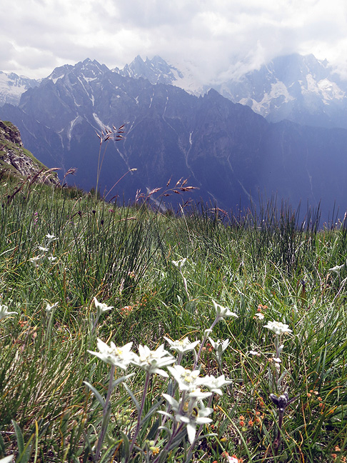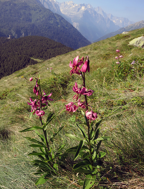 Our next day's walk brings us out of the Engadine, or nearly so, into the upper reaches of the Val Bregaglia. The granite peaks of this part of the region, appear in the background. Martagon lilies in the foreground! A somewhat rare sight, always beautifuli. |