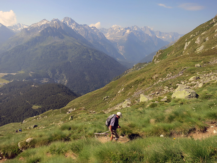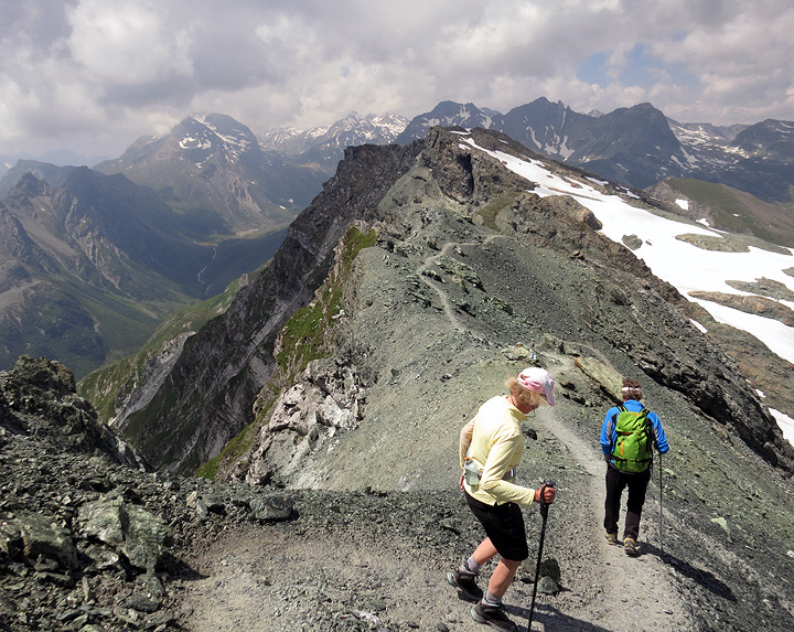 Descending from the summit, portions of our next day's route come into view on the left: the high and lonely Val Maroz. |
