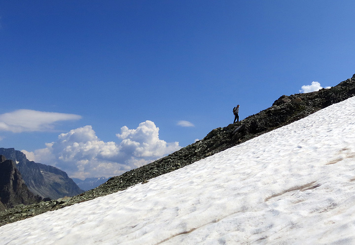 Higher up, lingering snowfields help us cool off as we approach the summit of Piz Lunghin. |