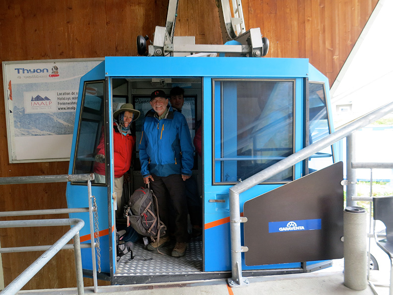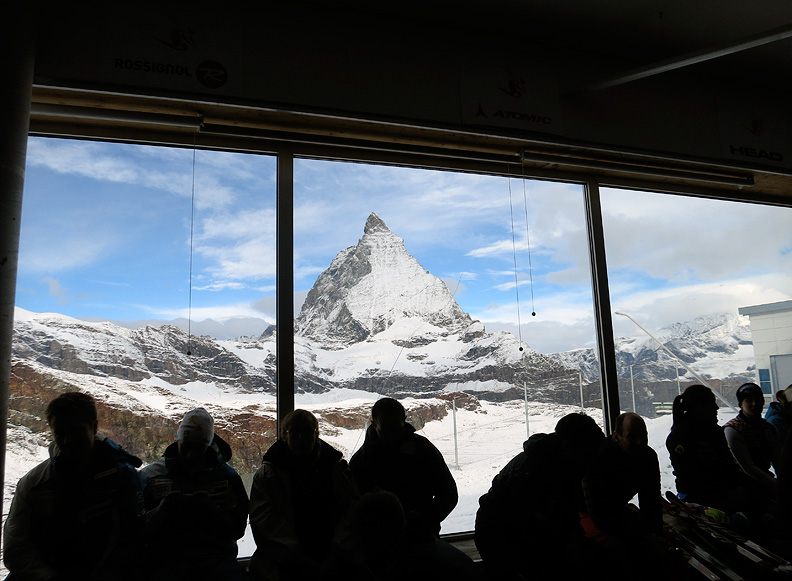 The following morning we were hoping to climb the Breithorn. A break in the weather was forecast for the first half of the day, so we made a run for it. A bit of a lull in the tram schedule had us cooling our heels with several dozen ski racers at Trockener Steg, but the views were fine. |
