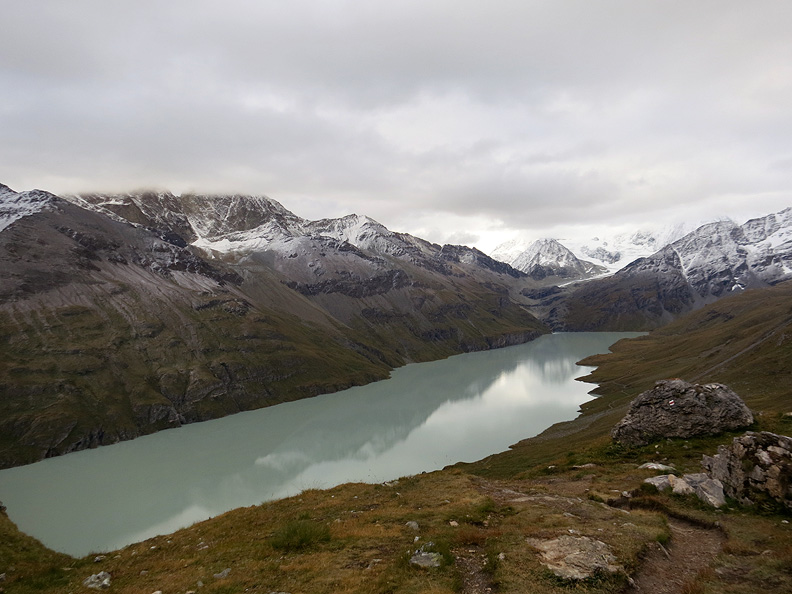 The waters of the Lac des Dix are glassy on this calm morning as we descend toward its shores. |