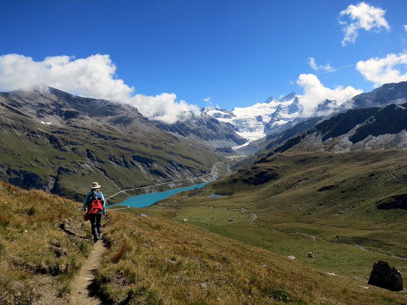 Still lovely sunshine as we descend toward the lake and dam of Moiry. The impressive icefall of the Moiry glacier in the distance. |