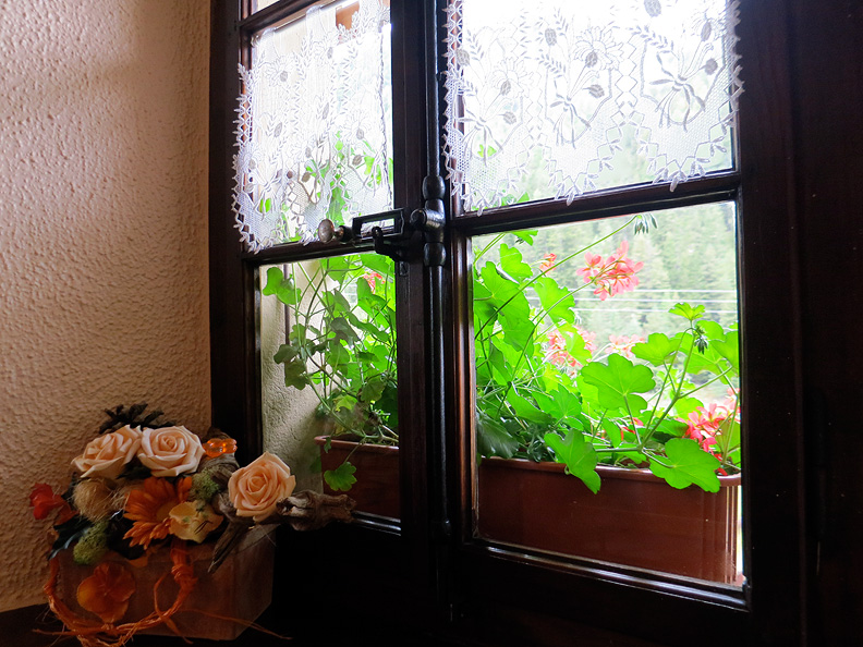 The following day the mixed weather pattern continued, with mostly sunny skies above a certain altitude, but mists below. Here we approach Bovine, where a rustic kitchen in an old-fashioned herdsman's summer chalet turns out beautiful pies and cakes. We scarfed them down with some hot coffee, yum! |