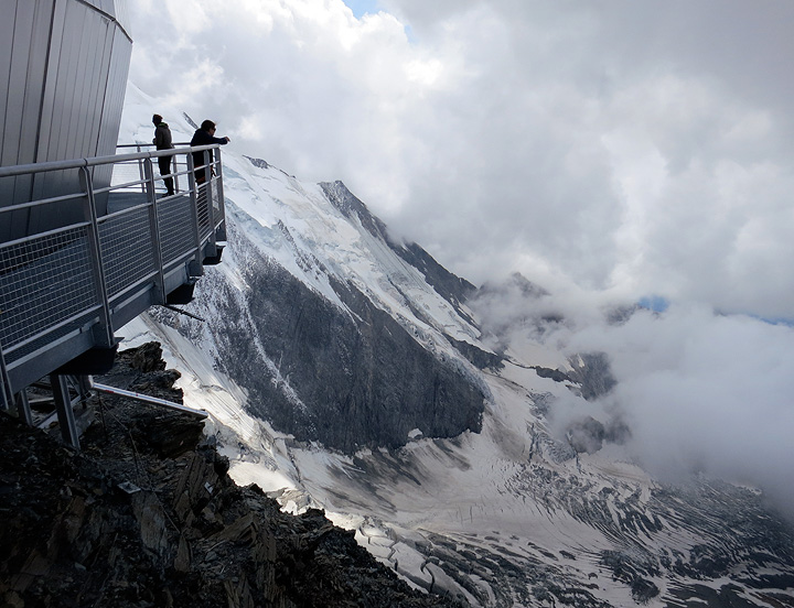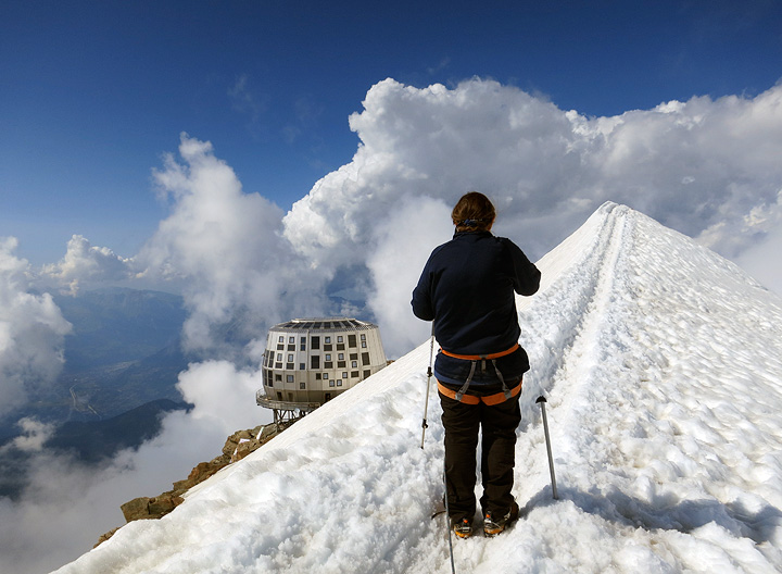 On day 2, we arrived at the new Gouter hut, shown here over Miriam's shoulder as we make the final approach. |