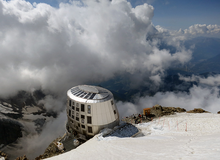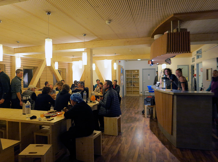 Sadly, our summit day was not to be, as storms were forecast for early in the day, and expected to dump a lot of new snow in addition to being quite electric. As we got up in the morning, the skies were already quite exciting with clouds. So we prepared to head down. This is the breakfast scene at the Gouter hut on this rather quiet morning. A lovely dining room! |