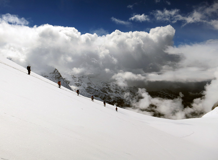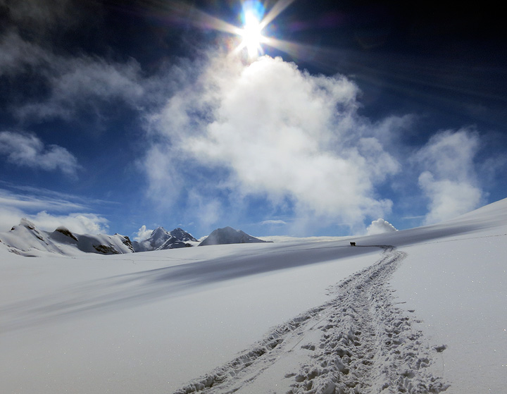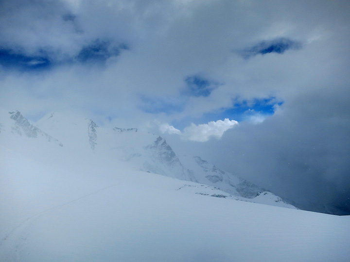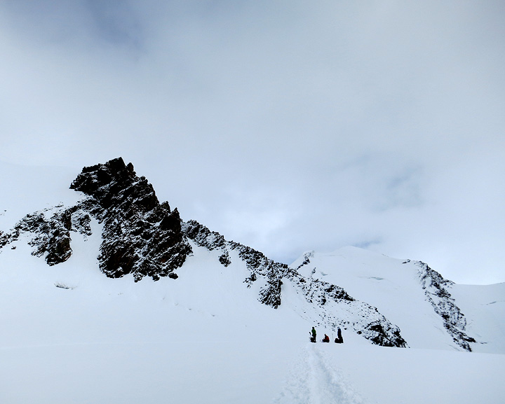 The forecast was quite mixed for our first day, but there were good sun breaks in the morning. Starting up toward the Breithorn pass from the Klein Matterhorn lift. |