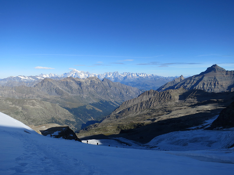Larry enjoys the sunshine high on the Gran Paradiso, wtih views of the Mont Blanc massif behind. |