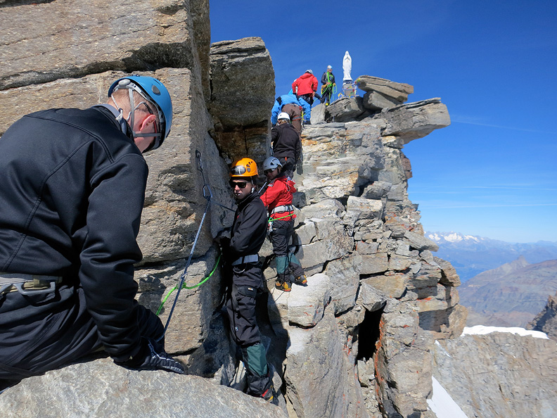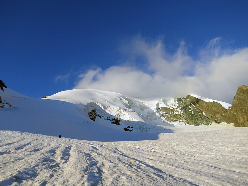 From Italy we headed eastward, to Saas Fee and the Britannia hut, for a try at the Hohlaubgrat on Allalinhorn (the right-most peak in this photo). |