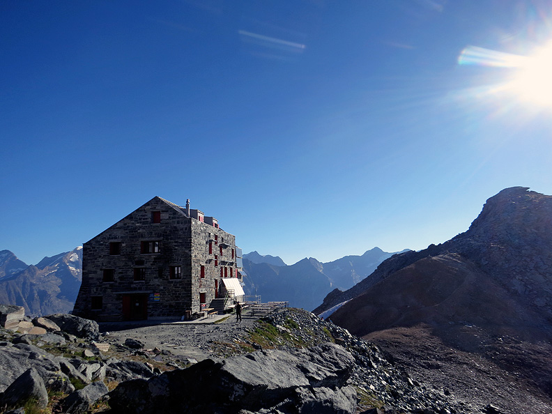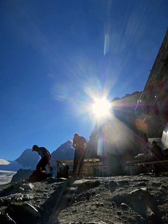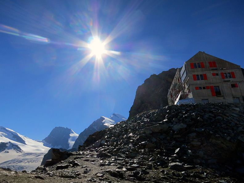 Evening views of Strahlhorn, Rimpfischhorn, and Allalinhorn from the hut's terrace. |