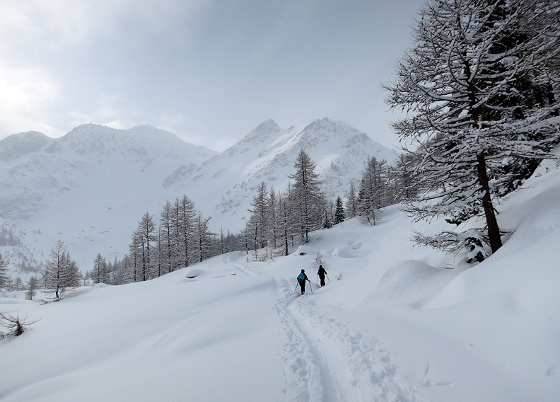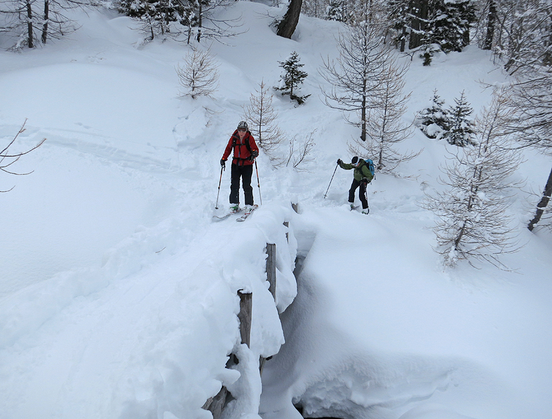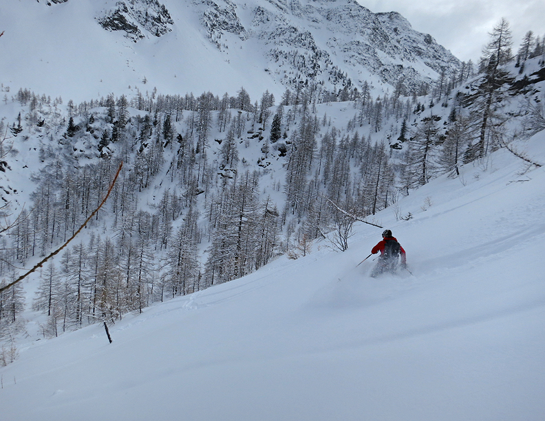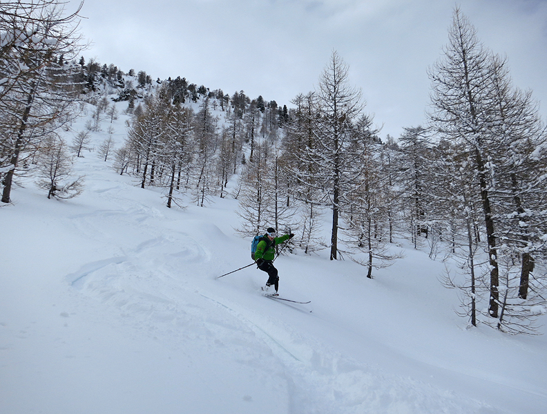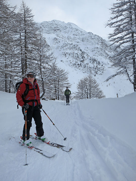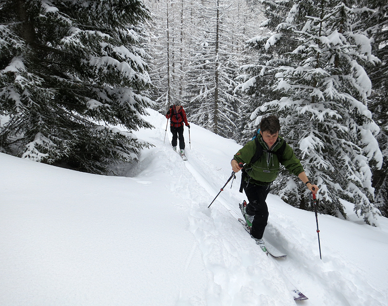 The following day was socked in and snowing hard in Chamonix. The weather was significantly better south of the border in Italy, so we headed up to the Cima Croce above the village of Arpy. Lovely skinning up through the still, snowy woods. |