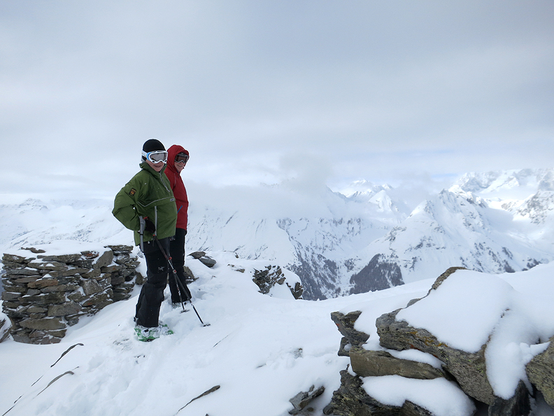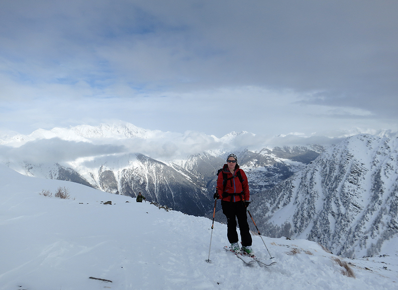 Though Sue and Rachel are both seasoned mountaineers, as we neared the summit Rachel announced that this was her first summit on skis! Looking eastward toward the peaks above the Grand St. Bernard Pass. |