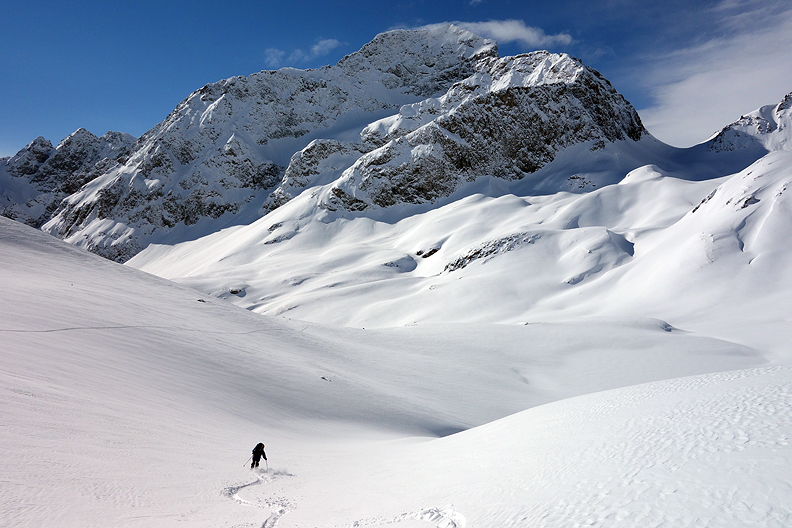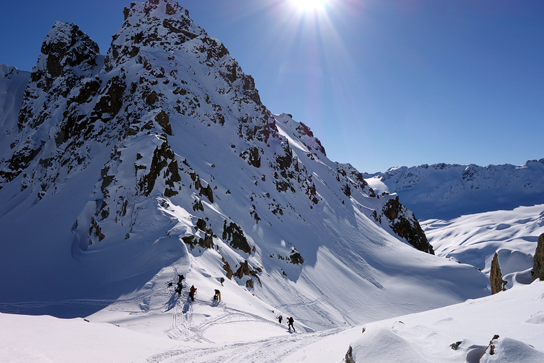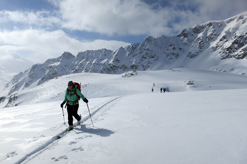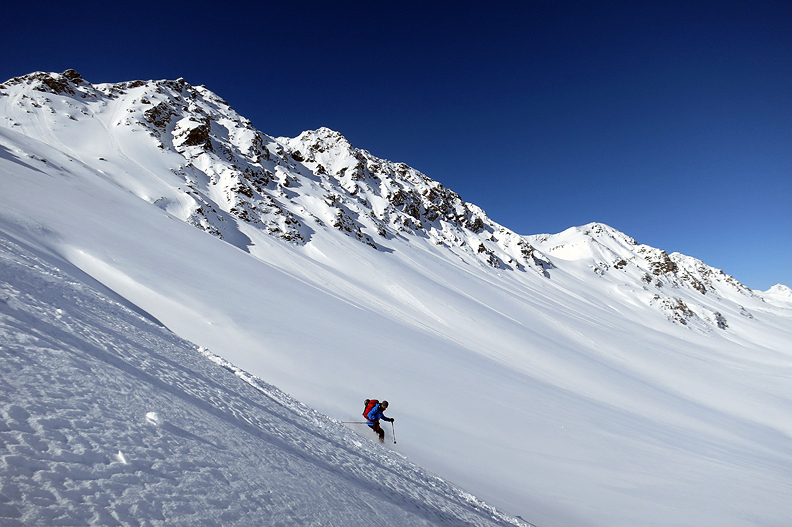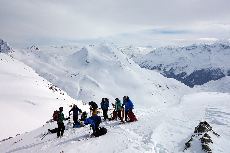 Some fun in a narrow gully brings us to the gentler slopes of the Alp Mulix. |