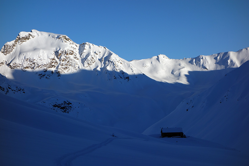 Our home for the evening; the Jenatsch hut, seen here in the growing evening shadows as we returned after an early evening lap up a nearby viewpoint. |
