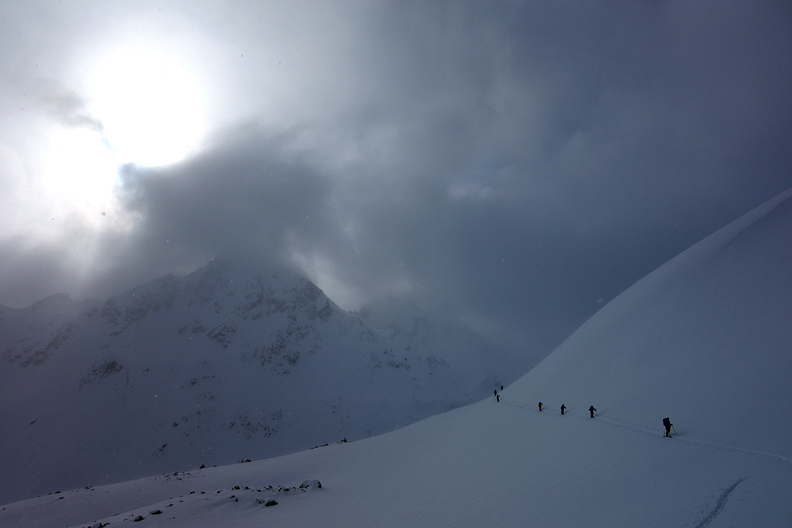 The weather looked more promising as we began our skin up the ridge of the Tschimas da Tisch. |