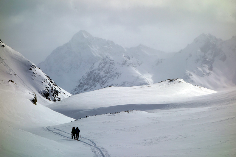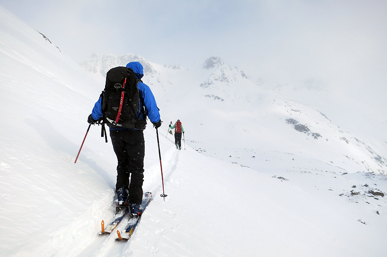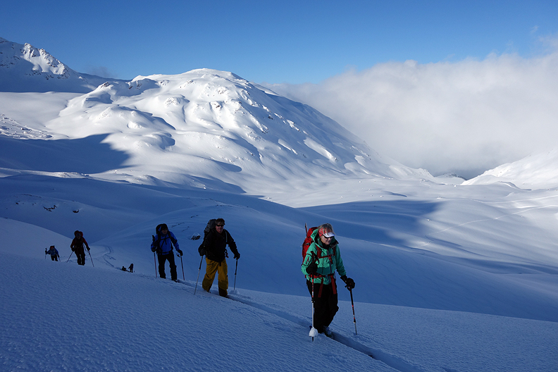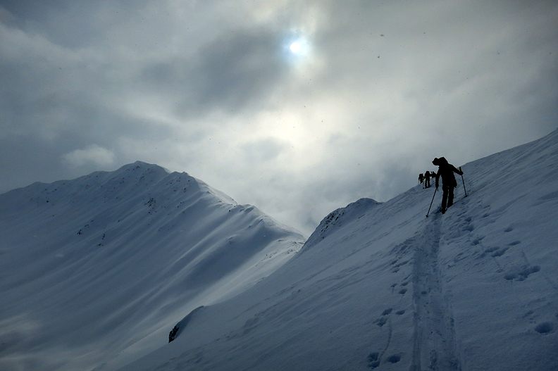 Skinning up to a pass north of the hut. |