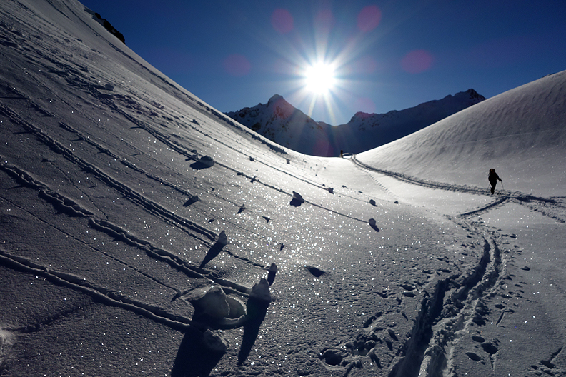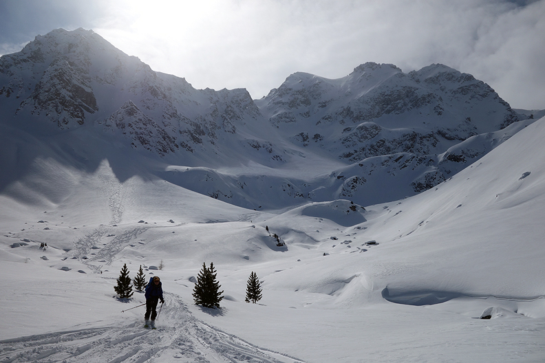 Heading up into the Vallorgia drainage, the sun is gaining power. |