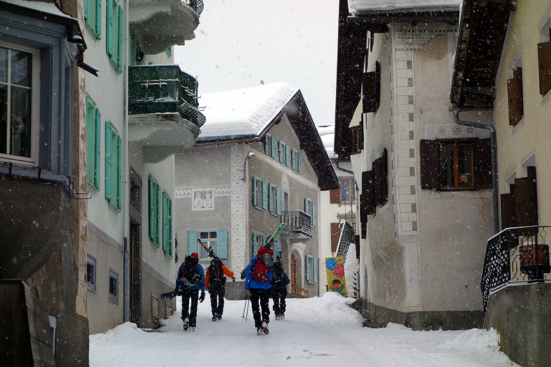 At the end of our road, the cute little town of Bergün. This is taken the following morning as we head out again in a light snowfall. |