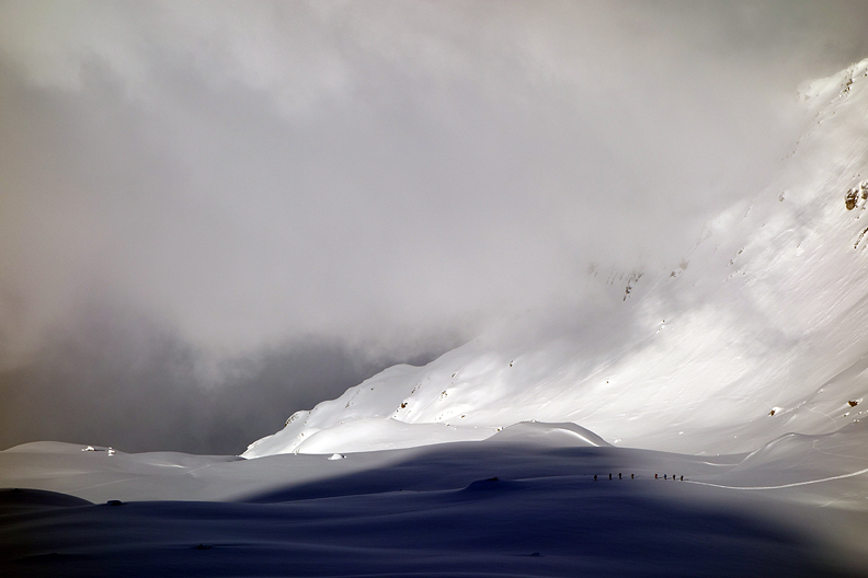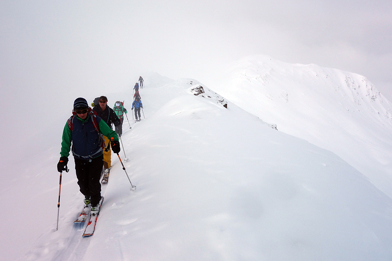 The following day started out rather in and out of mists, but the visibility was good, the winds not too strong, and the snow conditions outstanding for our tricky section traversing high on steep slopes above Val Bever. |