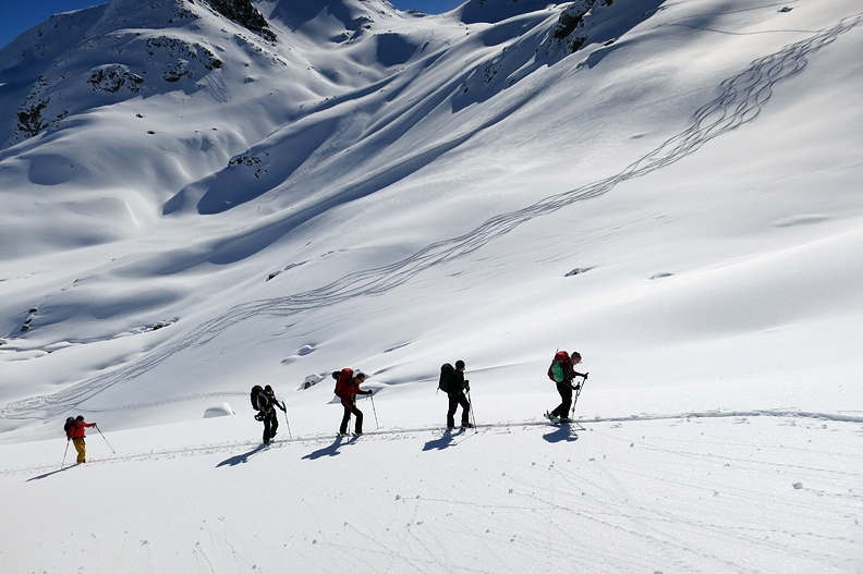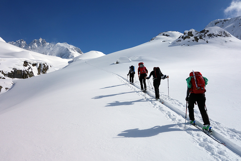 Leaving the Kesch hut behind, we finally get a sunny day for our journey to the Grialetsch hut. We climbed over the shoulder of a peak to gain some good north facing slopes to begin our day. |