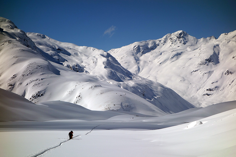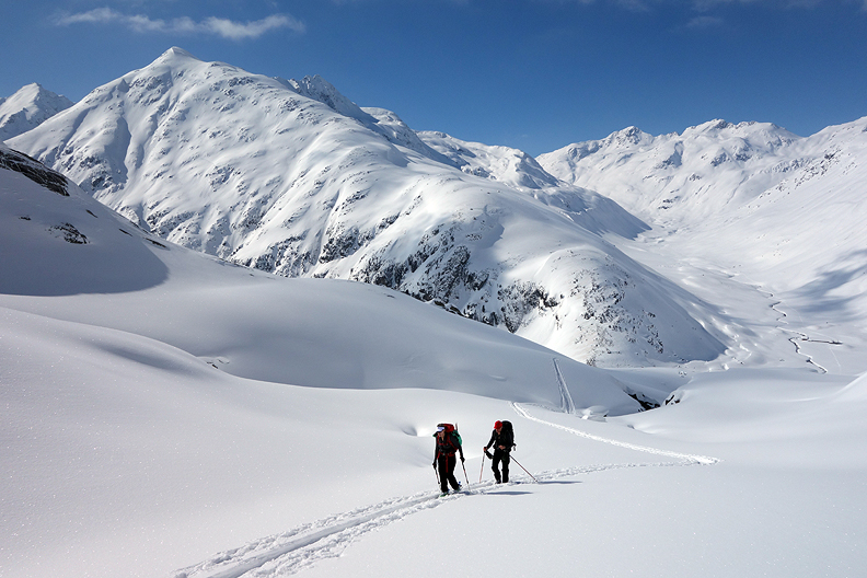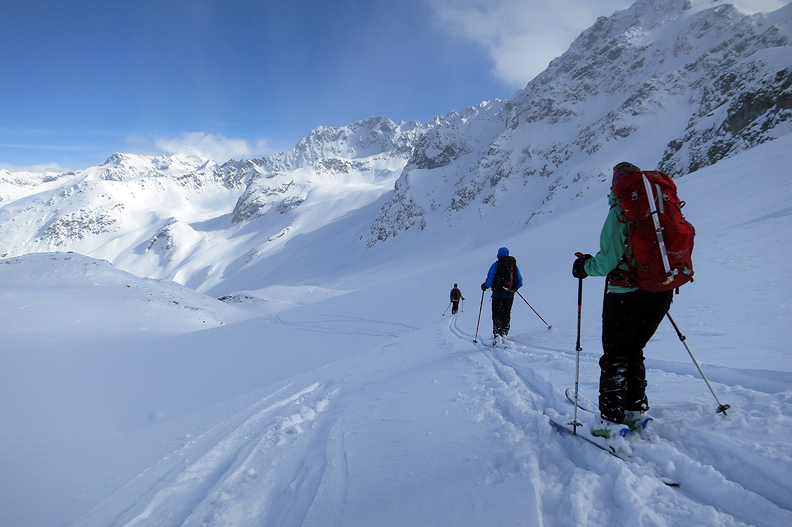 Ripping our skins to ski down into the headwaters of Val Bever. |