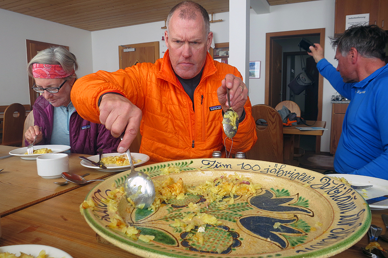 Back at the hut in time for lunch, a mighty mountain of Rösti, which we valiantly put away in no time. Jeff cleaning up the crumbs... |