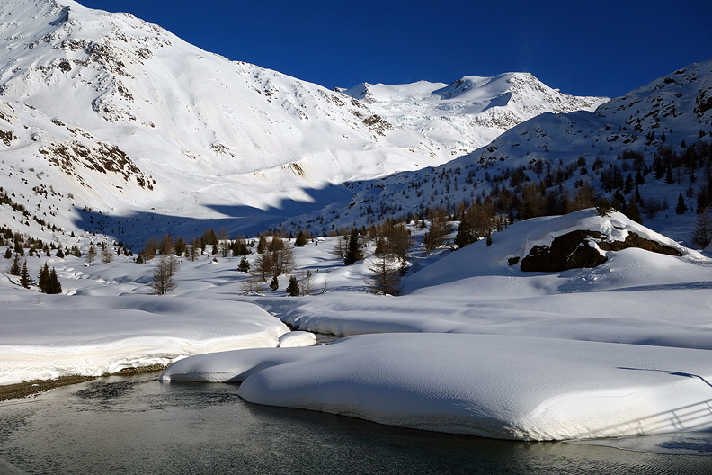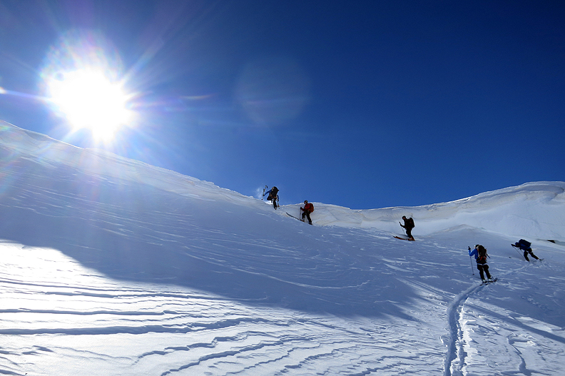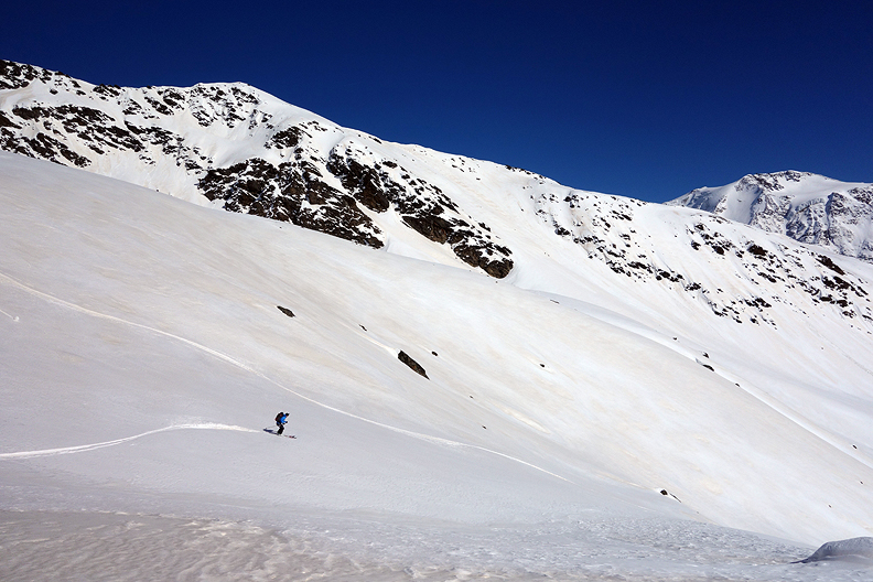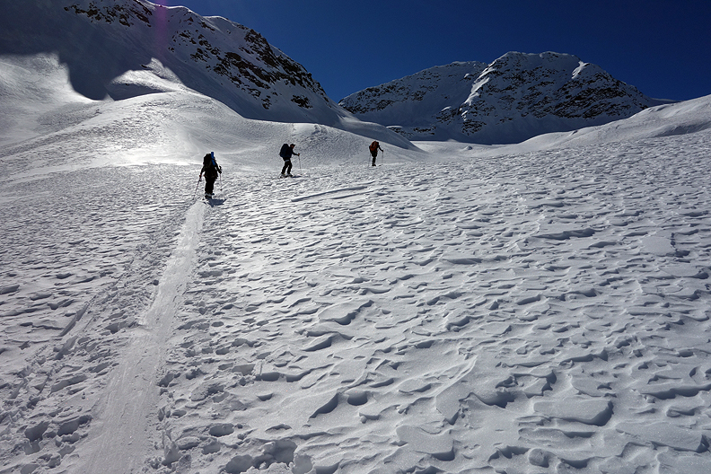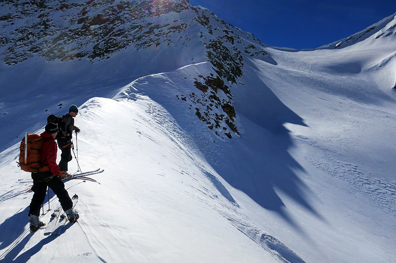 Skinning back up from our low point toward the Forni ridge. |