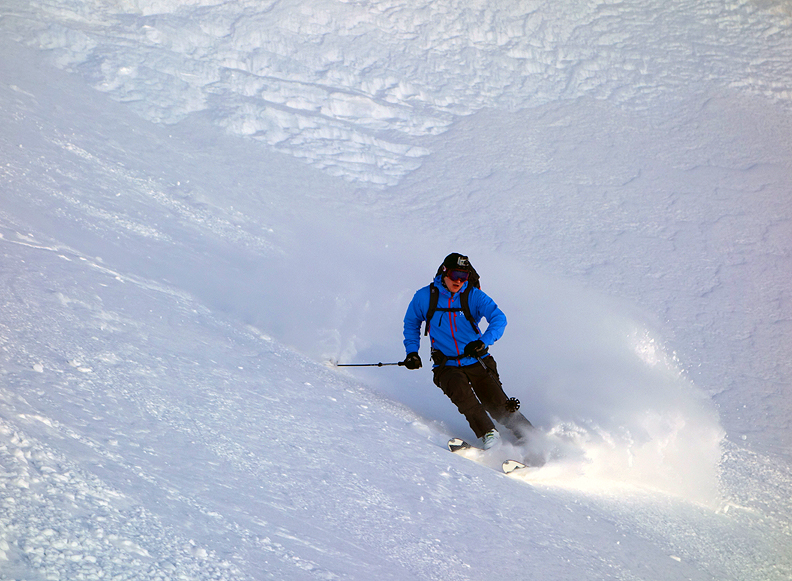 Wind effected, but cold north facing snow, Henrik has no problem skiing this! |
