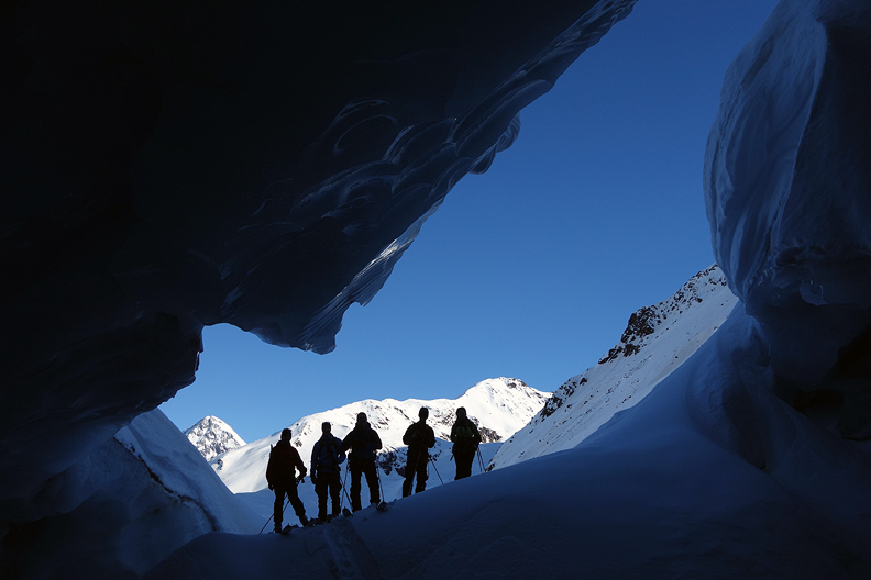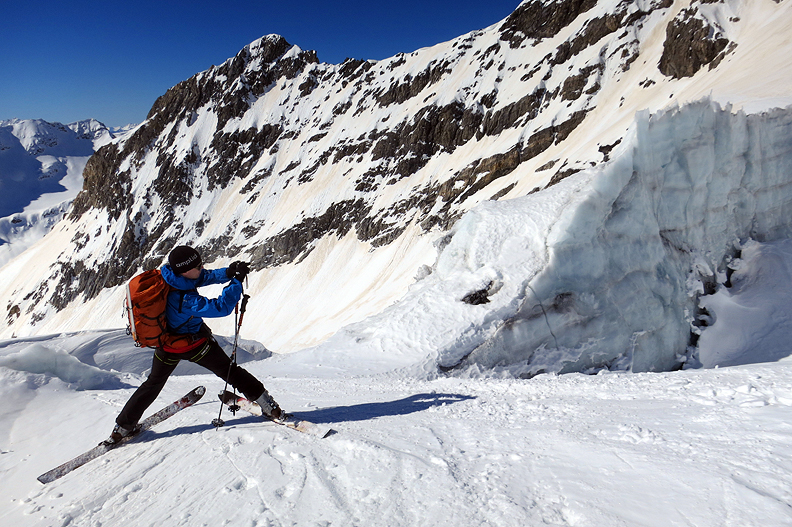 On our last day, we headed over the Col de la Pale Rosse and down the Vedretta de la Miniera glacier. Given the ample snow cover, we figured this tour promised to be more skiable than in past years we have visited. Baard gets a photo into one of the crevasses near the top of the glacier icefall. |