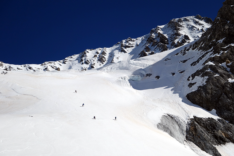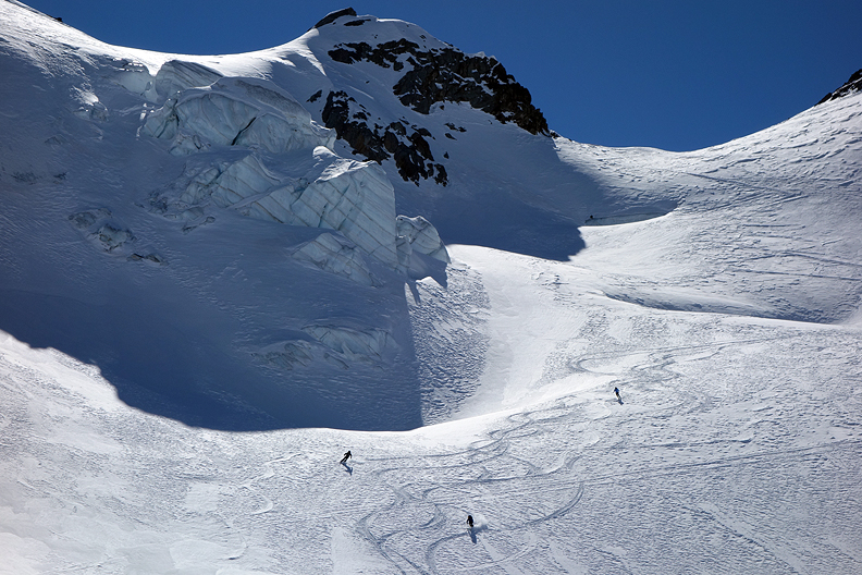 Lovely corn snow on the last of our descent of the Miniera glacier. |