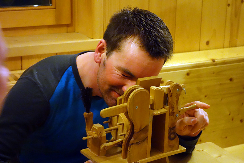 At the Pizzini hut, Morten samples the "snooss machine"; an elaborate contraption to deliver mint-flavored tabacco dust to the nostrils. |