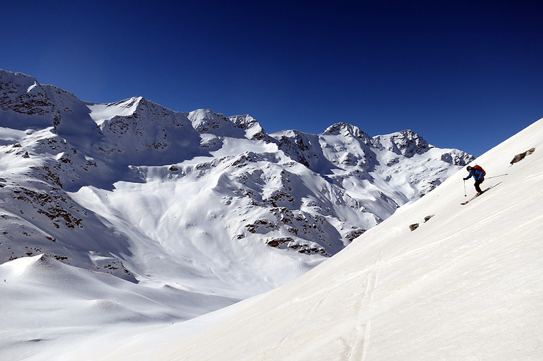 Pausing mid-way down our descent, we take in the view of the Forni Peaks, on the other side of which lies our destination and our cars. Near the left hand side of this background ridge is the Cima Centrale. We ultimately skinned up the slopes and bowl to its left in this picture, to gain the top and descend from there. |